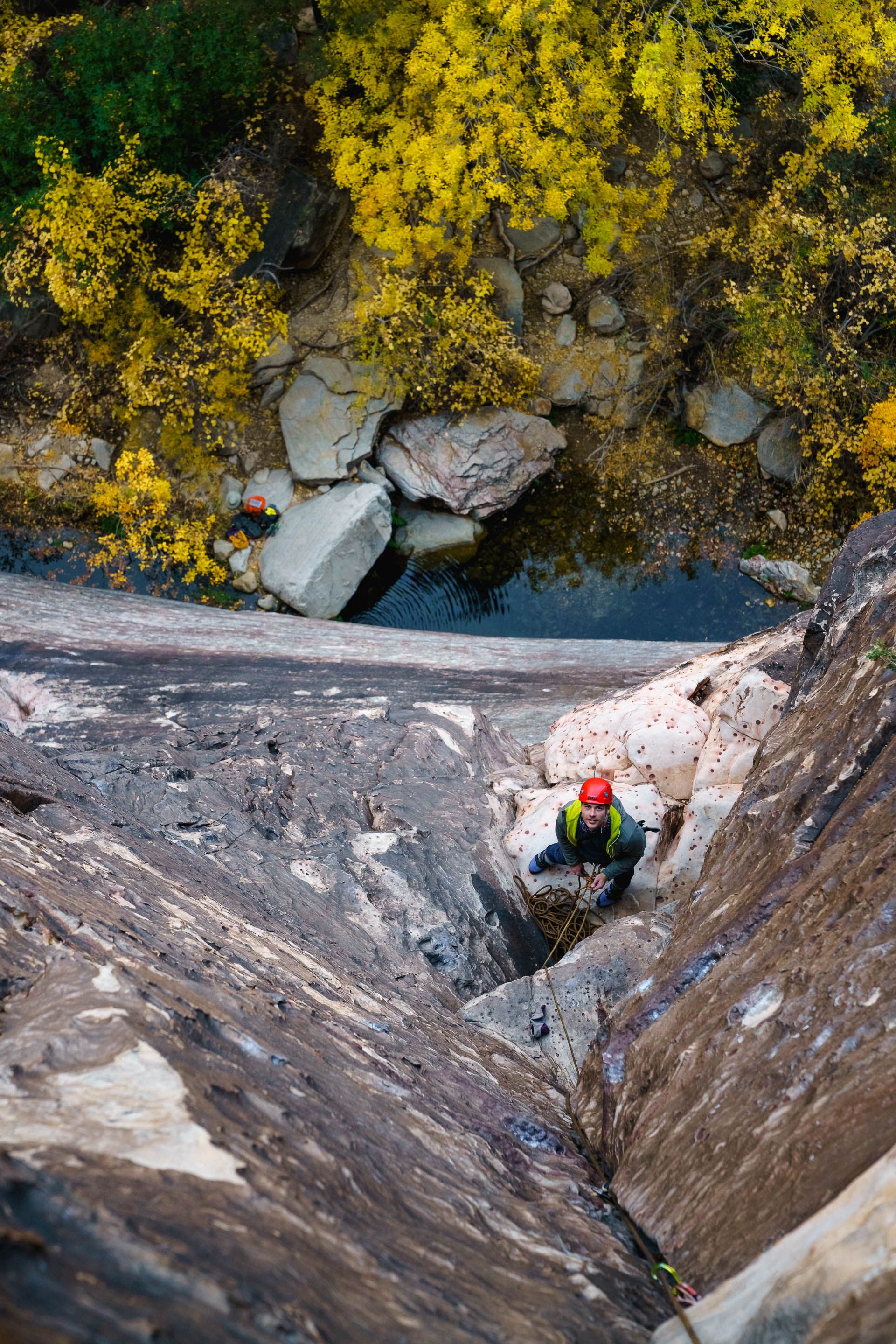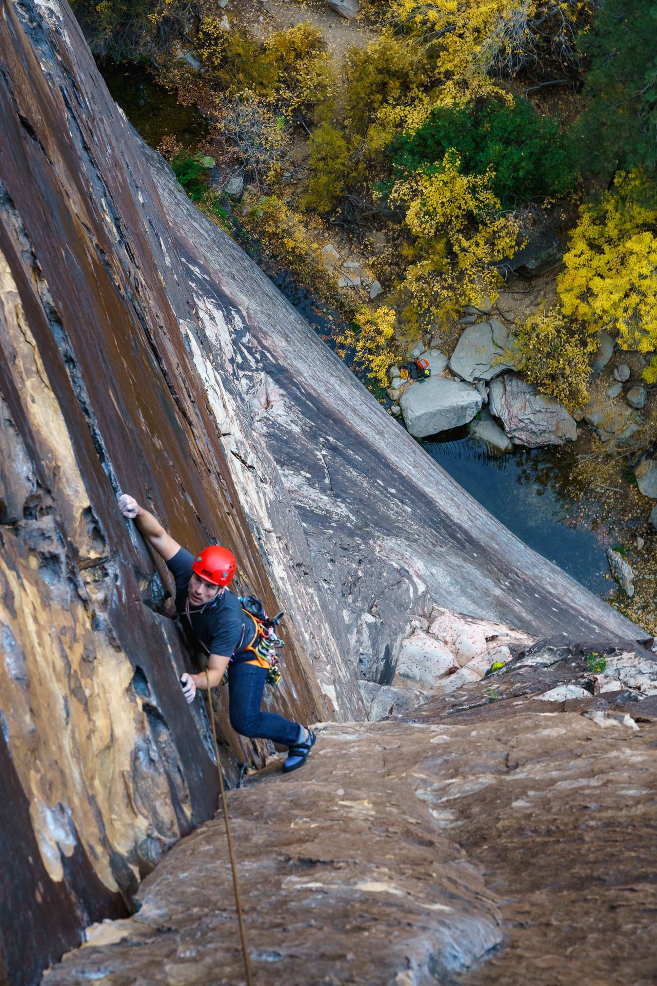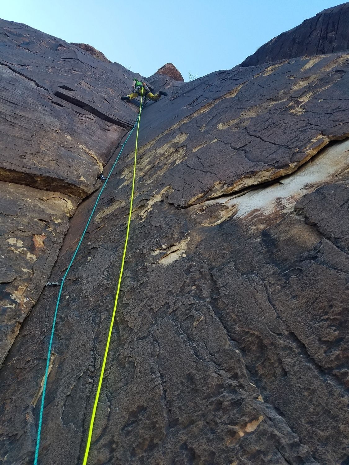 Things went swimmingly. I linked pitches 3 & 4 for a pretty great rope-stretcher that set us up for another epic link: a 70M crack climb by linking 5 & 6.
