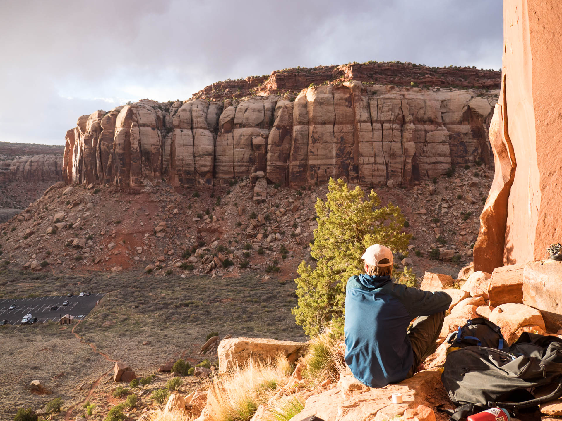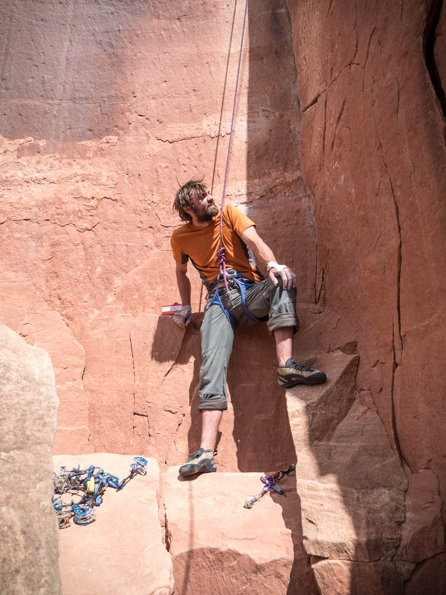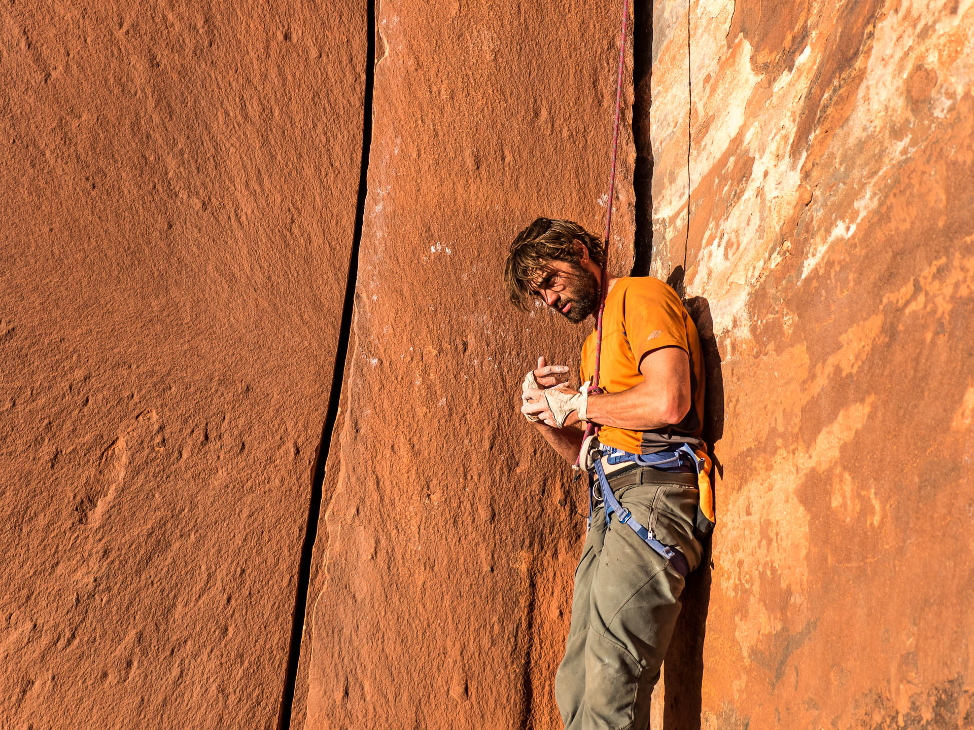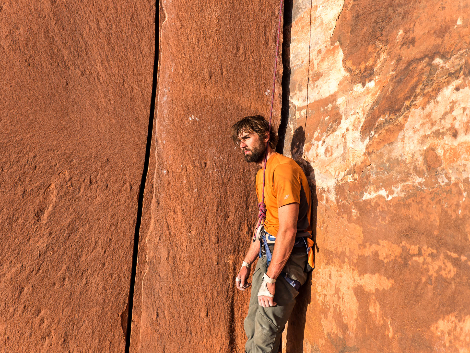 Jared rests on top of the fists pillar before committing to another lap on No Name Crack