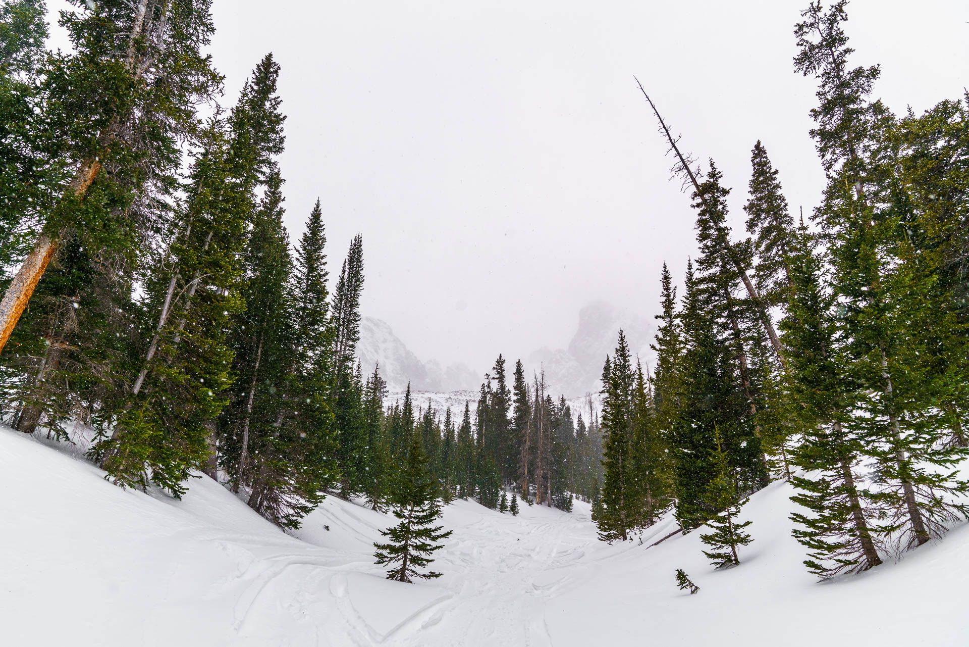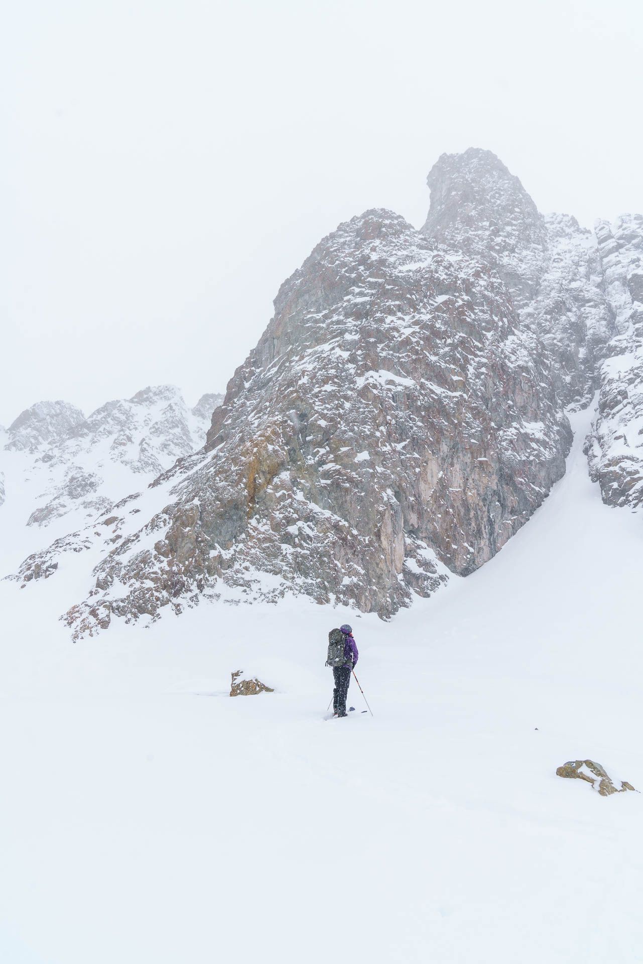 The air was still in the trees, and though snow was lightly falling I was comfortable in just a t-shirt. The crags were intermittently visible on the horizon between surges in the storm. I added layers after we stepped out of the shelter of the woods, where the snow fell more heavily and the wind pulled more strongly.