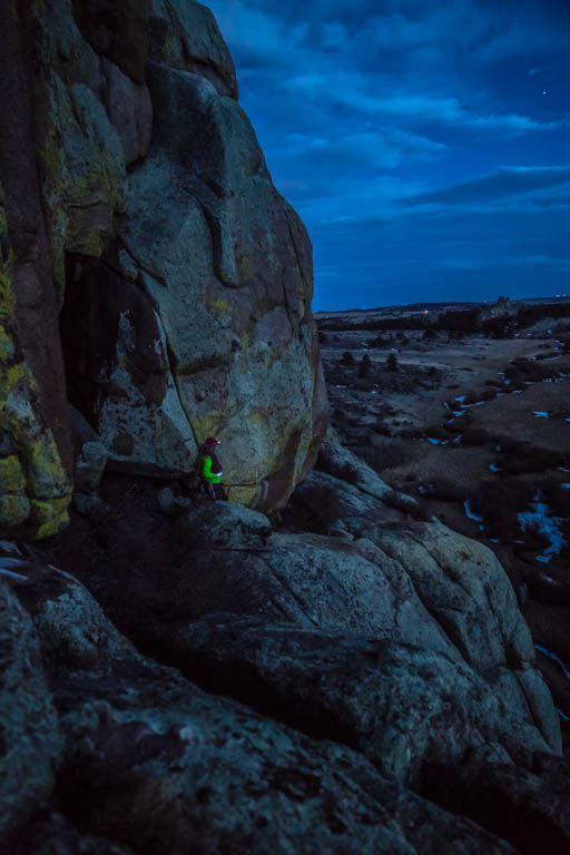 As I topped out the pitch the wind ripped the breath from my lungs, and for a moment shoved me back so forcefully that I teetered away from the wall. When Jared reached the top we moved slowly towards Giggles, one headlamp between us to help us navigate through the darkness and its galeforce winds.