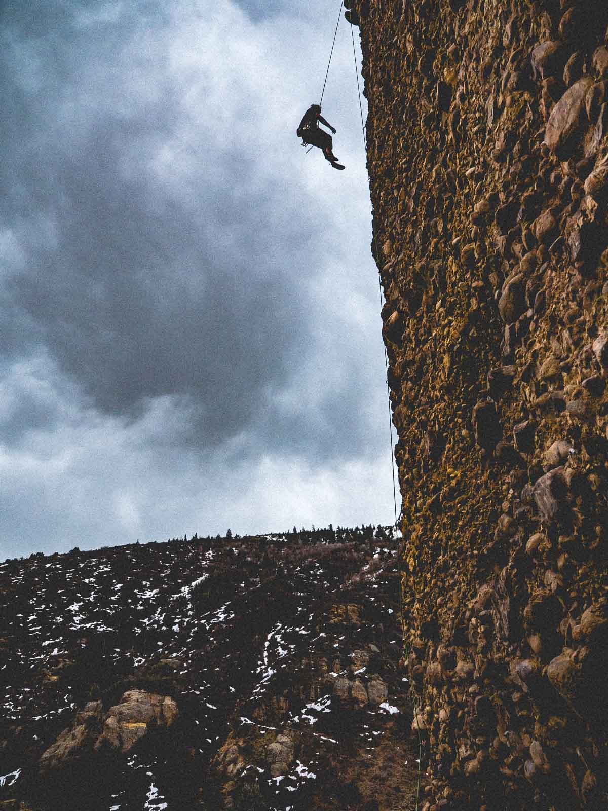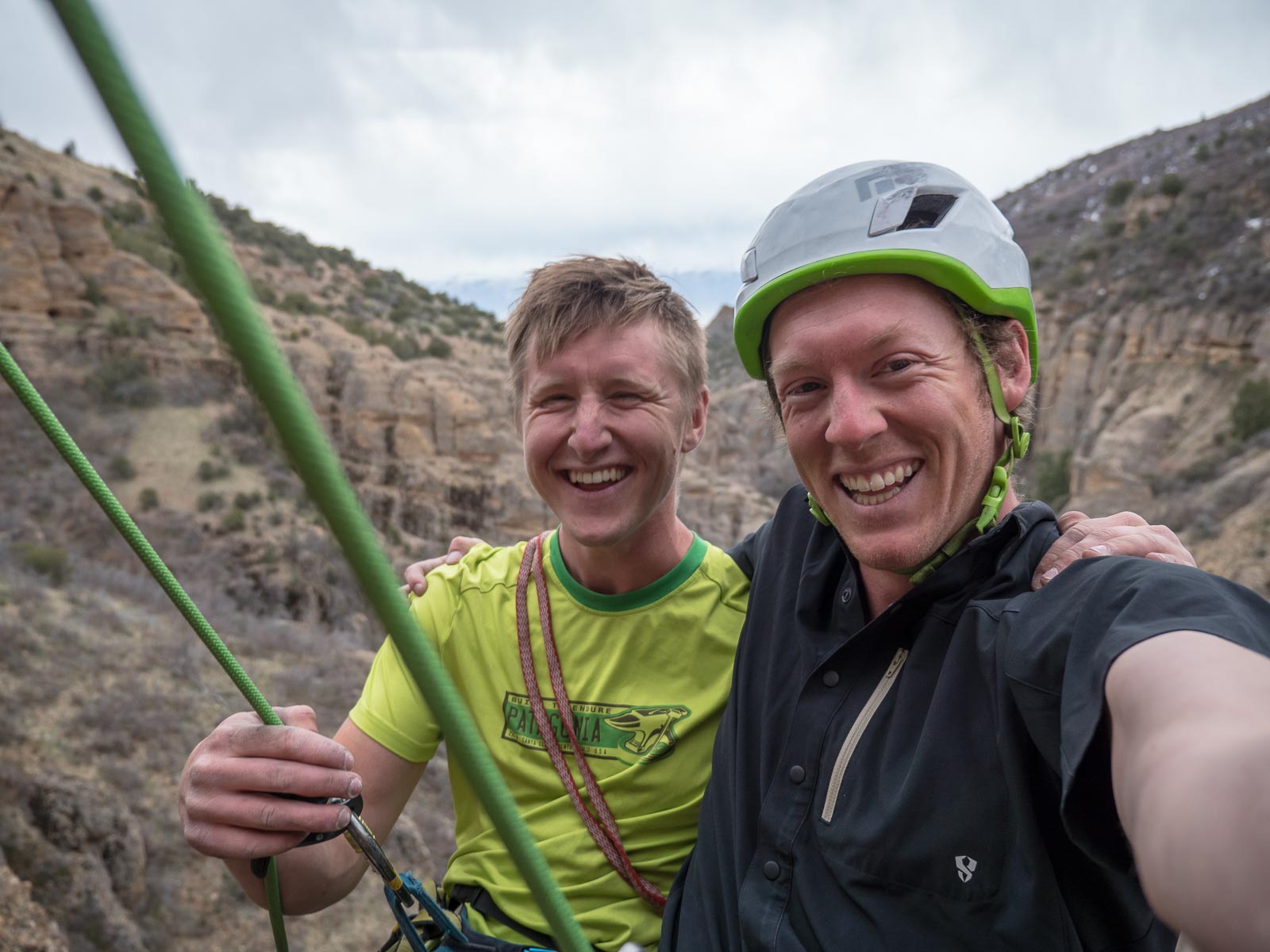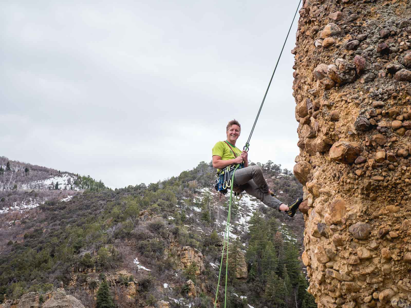 The helmet would make you think I'm all about safety first, but then you realize we're 150' above the ground, simul-rapping, and I'm holding my camera and my friend's shoulder, rather than my rope...