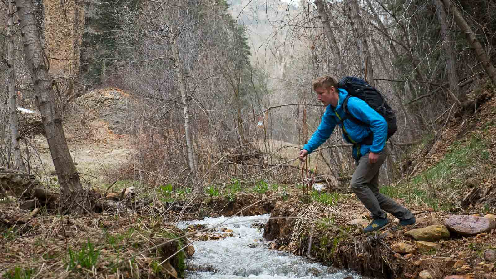 I cleaned in the sprinkle. David and I packed up and hiked back to the cars. The stream we had easily walked across earlier had grown, and I asked Dave to pause and let me set up to shoot his leap over its rushing waters.