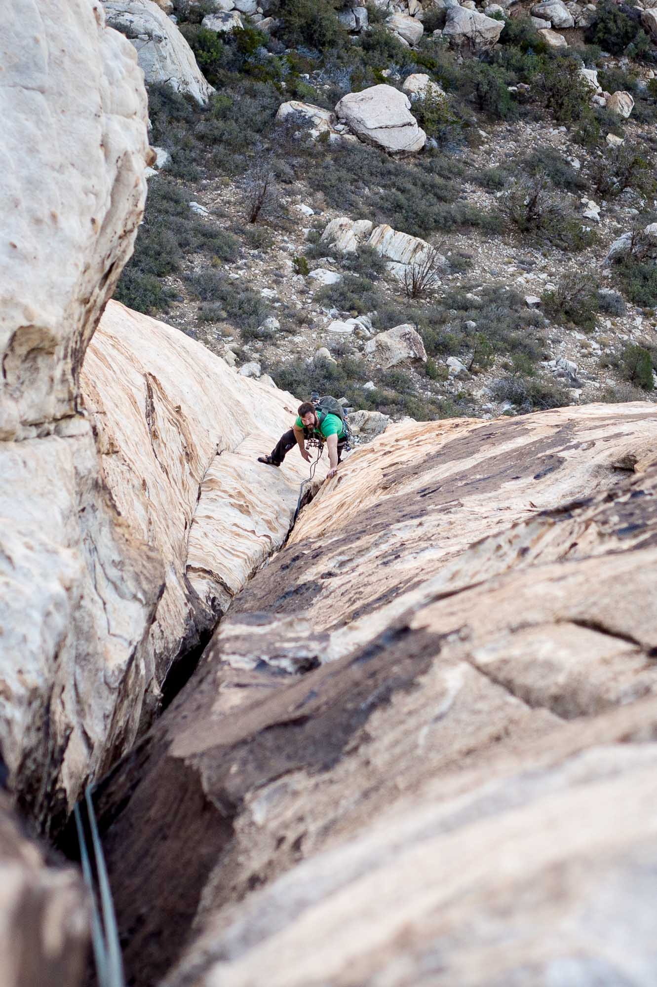 Darren took the first lead. After three hundred feet of climbing he belayed me up on a #4 and we switched off. I immediately got off route, but Darren caught my mistake before it went too terribly wrong. I downclimbed twenty feet and things went well after that.