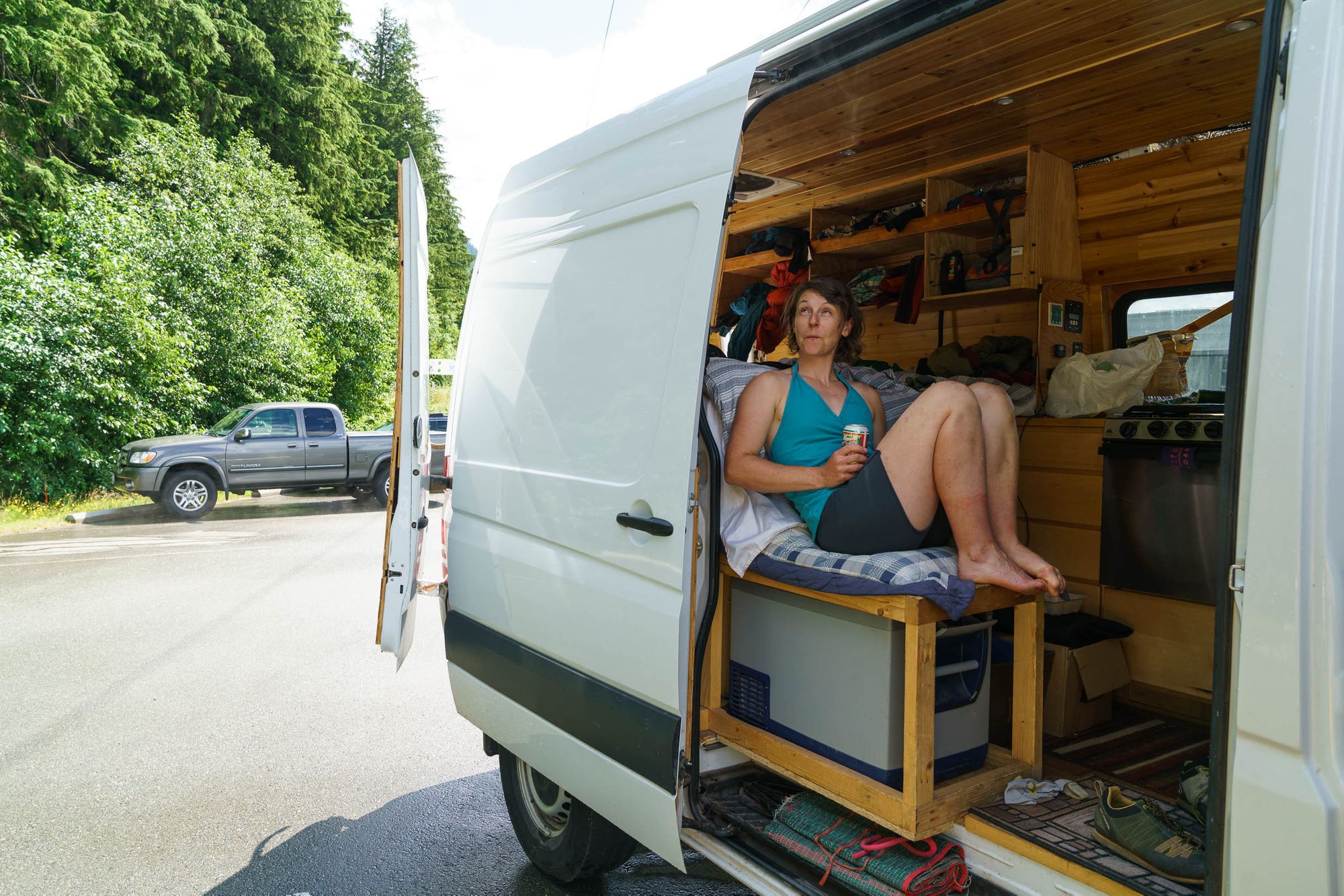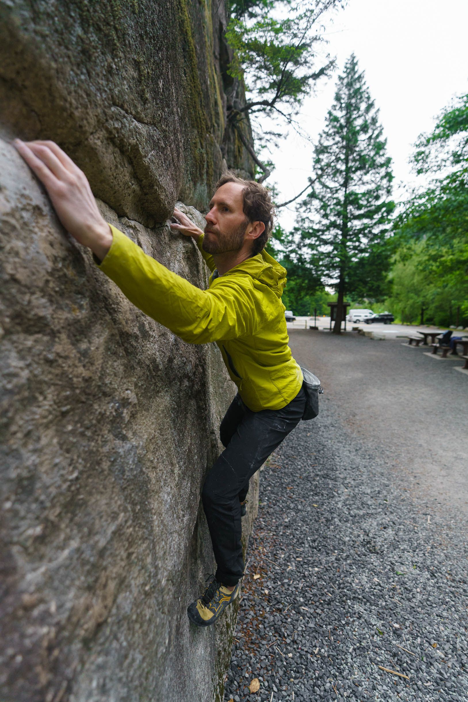 Another day, Claire and I got rained off Split Pillar right at the start of the eponymous pitch. We got back to the car, completely soaked, just in time for the skies to turn bluebird. We just had lunch in the van and enjoyed the splitter weather.