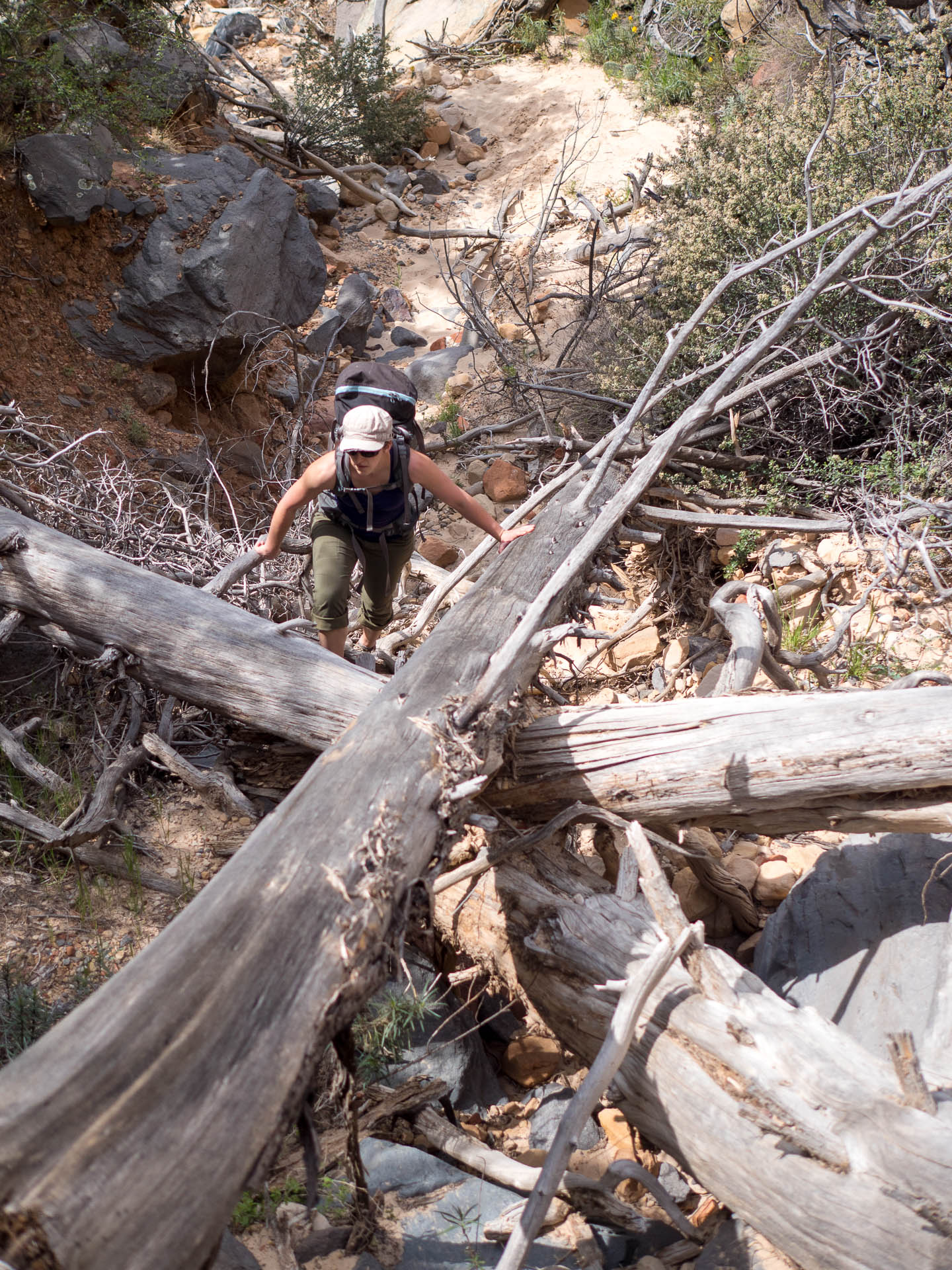 As we drew near the encasing sandstone walls and towers that formed our northern horizon our path grew rougher and wilder. We skirted over and under and around deadfall and flashflood chokes. At points the streambed became unpassable and we would scramble up one of its growing and steepening embankments only to clamber back down into it a little further on.