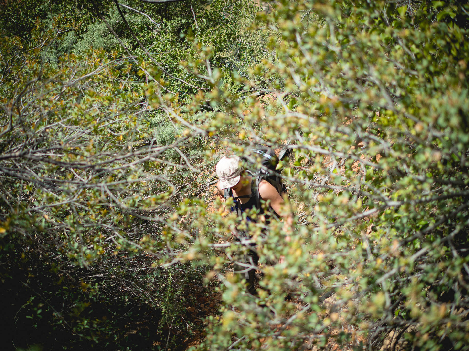 With only one short-lived misstep along the way, we climbed out of the streambed's path and made a beeline for Supercrack Tower, plainly obvious in front of us. The "trail" to it was a loose combination of dry dirt and frisbee shaped rocks that skated out from under our feet. It was often lost in thick foliage that painfully reminded me that the desert is not home to friendly greens.